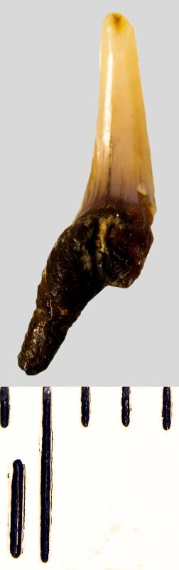 Мелкий боковой зуб с коронкой охристого цвета, колюще-режущего типа, S-образно изогнутой, с гладким режущим краем. С лингвальной стороны у основания коронки на эмали имеется скульптура в виде слабой продольной струйчатости. Корень бурый, арочный, умеренно массивный, со следами окатанности, правая ветвь утрачена. Имеется одна питательная борозда с лингвальной стороны корня. Добавочные зубцы коронки зуба отсутствуют.