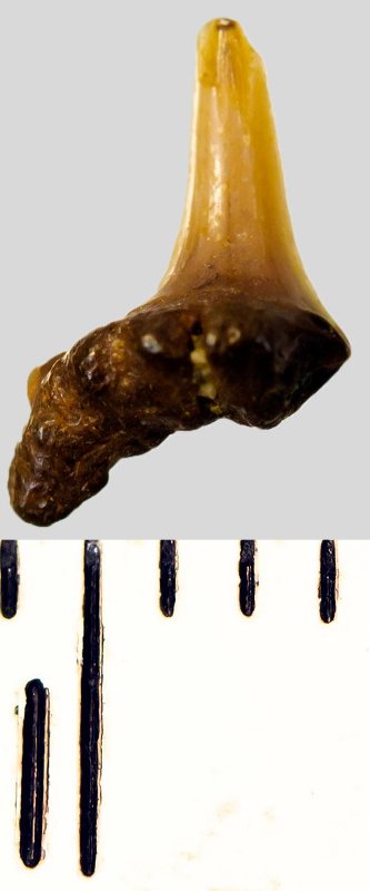 Мелкий боковой зуб с коронкой охристого цвета, колюще-режущего типа, S-образно изогнутой, с гладким режущим краем. С лингвальной стороны у основания коронки на эмали имеется скульптура в виде слабой продольной струйчатости. Корень бурый, арочный, умеренно массивный, со следами окатанности, правая ветвь утрачена. Имеется одна питательная борозда с лингвальной стороны корня. Добавочные зубцы коронки зуба отсутствуют.