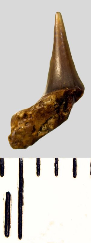 Мелкий боковой зуб с коронкой охристого цвета, колюще-режущего типа, S-образно изогнутой, с гладким режущим краем. С лингвальной стороны у основания коронки на эмали имеется скульптура в виде слабой продольной струйчатости. Корень бурый, арочный, умеренно массивный, со следами окатанности, правая ветвь утрачена. Имеется одна питательная борозда с лингвальной стороны корня. Добавочные зубцы коронки зуба отсутствуют.