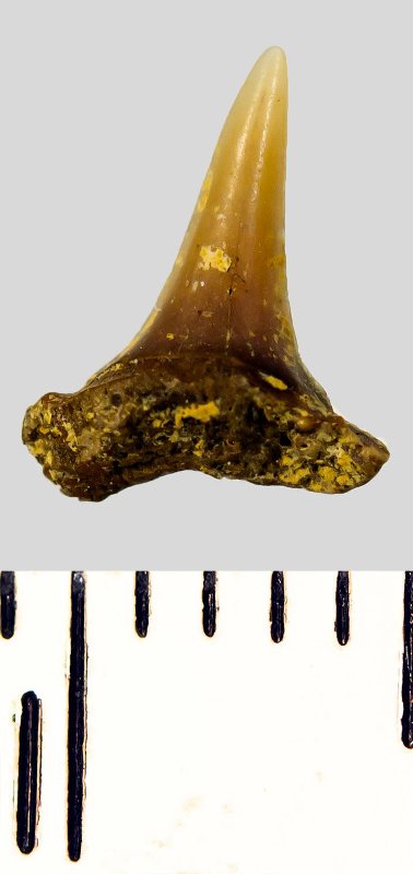 Мелкий боковой зуб с коронкой охристого цвета, колюще-режущего типа, S-образно изогнутой, с гладким режущим краем. С лингвальной стороны у основания коронки на эмали имеется скульптура в виде слабой продольной струйчатости. Корень бурый, арочный, умеренно массивный, со следами окатанности, правая ветвь утрачена. Имеется одна питательная борозда с лингвальной стороны корня. Добавочные зубцы коронки зуба отсутствуют.