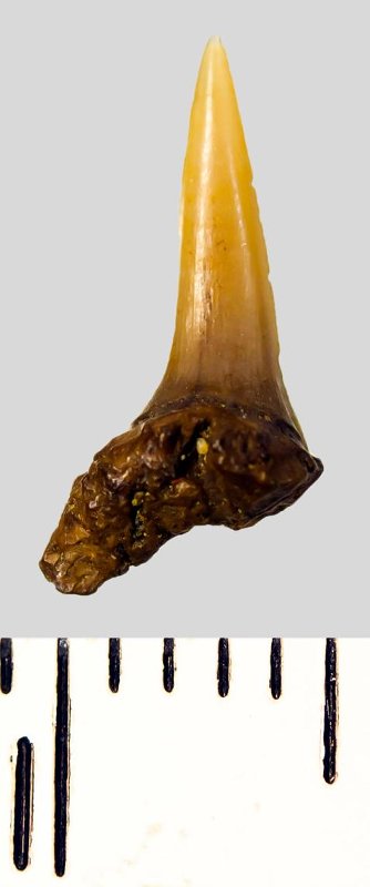 Мелкий боковой зуб с коронкой охристого цвета, колюще-режущего типа, S-образно изогнутой, с гладким режущим краем. С лингвальной стороны у основания коронки на эмали имеется скульптура в виде слабой продольной струйчатости. Корень бурый, арочный, умеренно массивный, со следами окатанности, правая ветвь утрачена. Имеется одна питательная борозда с лингвальной стороны корня. Добавочные зубцы коронки зуба отсутствуют.