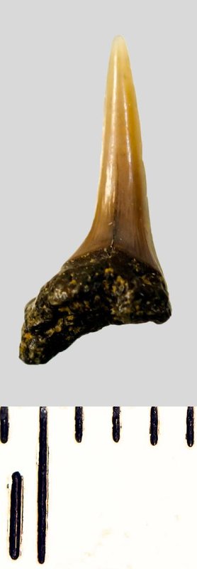 Мелкий боковой зуб с коронкой охристого цвета, колюще-режущего типа, S-образно изогнутой, с гладким режущим краем. С лингвальной стороны у основания коронки на эмали имеется скульптура в виде слабой продольной струйчатости. Корень бурый, арочный, умеренно массивный, со следами окатанности, правая ветвь утрачена. Имеется одна питательная борозда с лингвальной стороны корня. Добавочные зубцы коронки зуба отсутствуют.