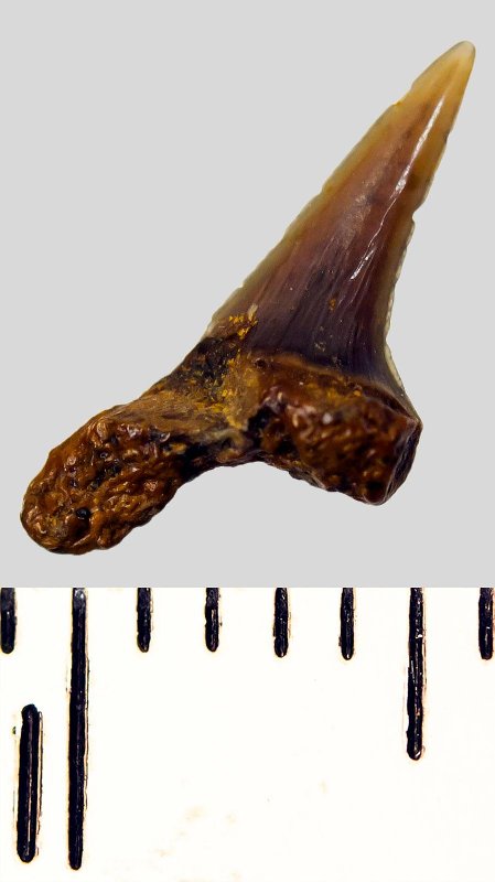 Мелкий боковой зуб с коронкой охристого цвета, колюще-режущего типа, S-образно изогнутой, с гладким режущим краем. С лингвальной стороны у основания коронки на эмали имеется скульптура в виде слабой продольной струйчатости. Корень бурый, арочный, умеренно массивный, со следами окатанности, правая ветвь утрачена. Имеется одна питательная борозда с лингвальной стороны корня. Добавочные зубцы коронки зуба отсутствуют.