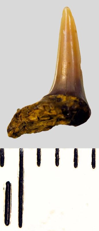 Мелкий боковой зуб с коронкой охристого цвета, колюще-режущего типа, S-образно изогнутой, с гладким режущим краем. С лингвальной стороны у основания коронки на эмали имеется скульптура в виде слабой продольной струйчатости. Корень бурый, арочный, умеренно массивный, со следами окатанности, правая ветвь утрачена. Имеется одна питательная борозда с лингвальной стороны корня. Добавочные зубцы коронки зуба отсутствуют.