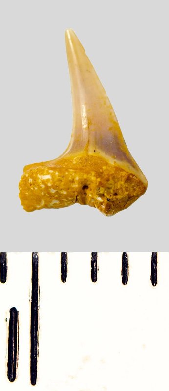 Зуб. Акула. Eostriatolamia subulata (Agassiz, 1843). Классификация: Хордовые Chordata, Позвоночные Vertebrata, Хрящевые рыбы Chondrichthyes, Пластиножаберные Elasmobranchii, Акулы Selachii, Ламнообразные Lamniformes, Песчаные акулы Odontaspididae