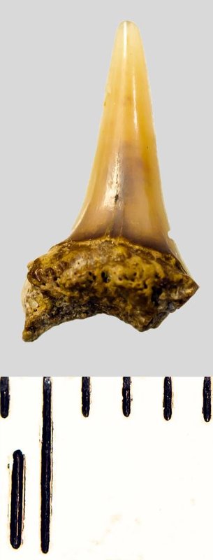 Мелкий боковой зуб с коронкой охристого цвета, колюще-режущего типа, S-образно изогнутой, с гладким режущим краем. С лингвальной стороны у основания коронки на эмали имеется скульптура в виде слабой продольной струйчатости. Корень бурый, арочный, умеренно массивный, со следами окатанности, правая ветвь утрачена. Имеется одна питательная борозда с лингвальной стороны корня. Добавочные зубцы коронки зуба отсутствуют.