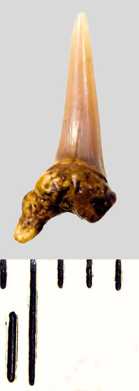 Мелкий боковой зуб с коронкой охристого цвета, колюще-режущего типа, S-образно изогнутой, с гладким режущим краем. С лингвальной стороны у основания коронки на эмали имеется скульптура в виде слабой продольной струйчатости. Корень бурый, арочный, умеренно массивный, со следами окатанности, правая ветвь утрачена. Имеется одна питательная борозда с лингвальной стороны корня. Добавочные зубцы коронки зуба отсутствуют.