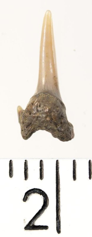 Мелкий боковой зуб с коронкой рыжевато-бежевого цвета, колюще-режущего типа, S-образно изогнутой, с гладким режущим краем. С лингвальной стороны у основания коронки на эмали имеется скульптура в виде слабой продольной струйчатости. Корень бурый, арочный, умеренно массивный, со следами окатанности. Имеется одна питательная борозда с лингвальной стороны корня. Имелась одна пара добавочных зубцов коронки, сохранился только левый.