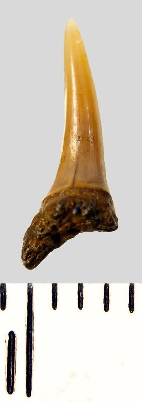 Мелкий боковой зуб с коронкой охристого цвета, колюще-режущего типа, S-образно изогнутой, с гладким режущим краем. С лингвальной стороны у основания коронки на эмали имеется скульптура в виде слабой продольной струйчатости. Корень бурый, арочный, умеренно массивный, со следами окатанности, правая ветвь утрачена. Имеется одна питательная борозда с лингвальной стороны корня. Добавочные зубцы коронки зуба отсутствуют.