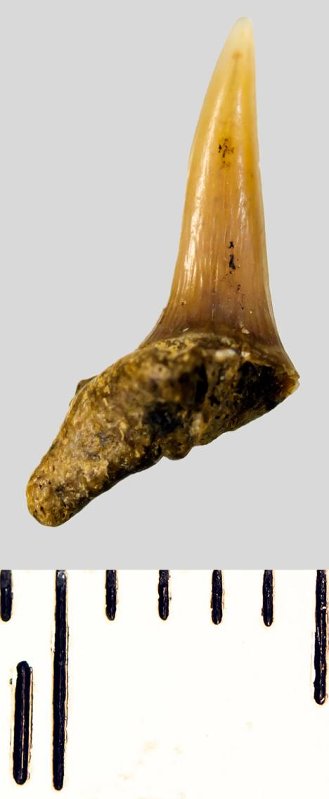 Зуб. Акула. Eostriatolamia subulata (Agassiz, 1843). Классификация: Хордовые Chordata, Позвоночные Vertebrata, Хрящевые рыбы Chondrichthyes, Пластиножаберные Elasmobranchii, Акулы Selachii, Ламнообразные Lamniformes, Песчаные акулы Odontaspididae