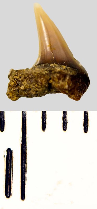 Зуб. Акула. Eostriatolamia subulata (Agassiz, 1843). Классификация: Хордовые Chordata, Позвоночные Vertebrata, Хрящевые рыбы Chondrichthyes, Пластиножаберные Elasmobranchii, Акулы Selachii, Ламнообразные Lamniformes, Песчаные акулы Odontaspididae