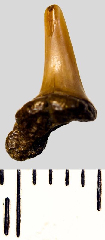 Мелкий боковой зуб с коронкой охристого цвета, колюще-режущего типа, S-образно изогнутой, с гладким режущим краем. С лингвальной стороны у основания коронки на эмали имеется скульптура в виде слабой продольной струйчатости. Корень бурый, арочный, умеренно массивный, со следами окатанности, правая ветвь утрачена. Имеется одна питательная борозда с лингвальной стороны корня. Добавочные зубцы коронки зуба отсутствуют.