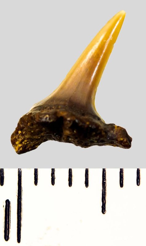 Мелкий боковой зуб с коронкой охристого цвета, колюще-режущего типа, S-образно изогнутой, с гладким режущим краем. С лингвальной стороны у основания коронки на эмали имеется скульптура в виде слабой продольной струйчатости. Корень бурый, арочный, умеренно массивный, со следами окатанности, правая ветвь утрачена. Имеется одна питательная борозда с лингвальной стороны корня. Добавочные зубцы коронки зуба отсутствуют.