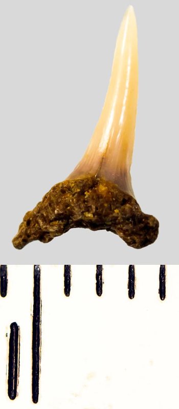 Мелкий боковой зуб с коронкой охристого цвета, колюще-режущего типа, S-образно изогнутой, с гладким режущим краем. С лингвальной стороны у основания коронки на эмали имеется скульптура в виде слабой продольной струйчатости. Корень бурый, арочный, умеренно массивный, со следами окатанности, правая ветвь утрачена. Имеется одна питательная борозда с лингвальной стороны корня. Добавочные зубцы коронки зуба отсутствуют.