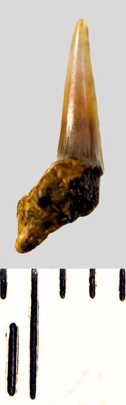 Мелкий боковой зуб с коронкой охристого цвета, колюще-режущего типа, S-образно изогнутой, с гладким режущим краем. С лингвальной стороны у основания коронки на эмали имеется скульптура в виде слабой продольной струйчатости. Корень бурый, арочный, умеренно массивный, со следами окатанности, правая ветвь утрачена. Имеется одна питательная борозда с лингвальной стороны корня. Добавочные зубцы коронки зуба отсутствуют.