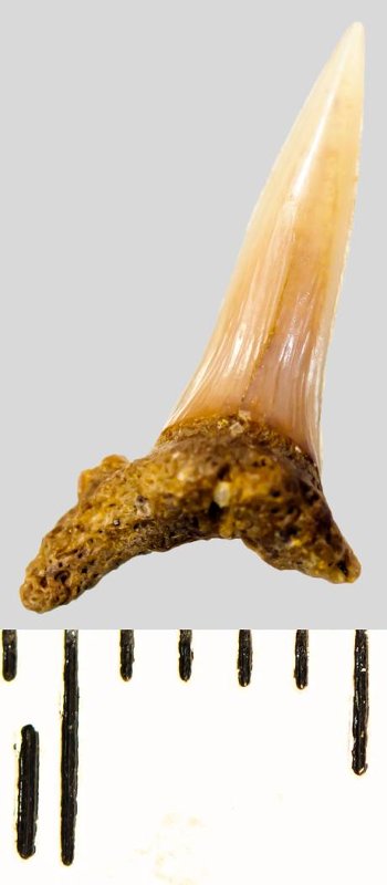 Мелкий боковой зуб с коронкой охристого цвета, колюще-режущего типа, S-образно изогнутой, с гладким режущим краем. С лингвальной стороны у основания коронки на эмали имеется скульптура в виде слабой продольной струйчатости. Корень бурый, арочный, умеренно массивный, со следами окатанности, правая ветвь утрачена. Имеется одна питательная борозда с лингвальной стороны корня. Добавочные зубцы коронки зуба отсутствуют.