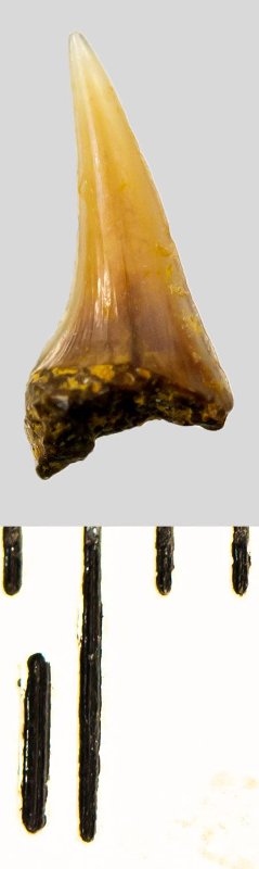 Зуб. Акула. Eostriatolamia subulata (Agassiz, 1843). Классификация: Хордовые Chordata, Позвоночные Vertebrata, Хрящевые рыбы Chondrichthyes, Пластиножаберные Elasmobranchii, Акулы Selachii, Ламнообразные Lamniformes, Песчаные акулы Odontaspididae