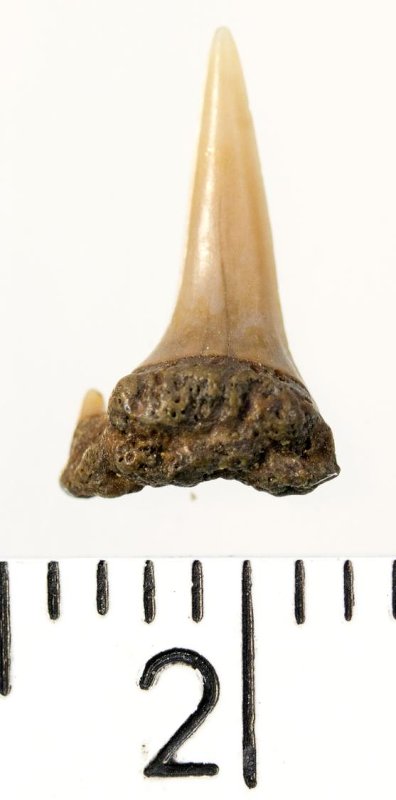 Зуб. Акула. Eostriatolamia subulata (Agassiz, 1843). Классификация: Хордовые Chordata, Позвоночные Vertebrata, Хрящевые рыбы Chondrichthyes, Пластиножаберные Elasmobranchii, Акулы Selachii, Ламнообразные Lamniformes, Песчаные акулы Odontaspididae
