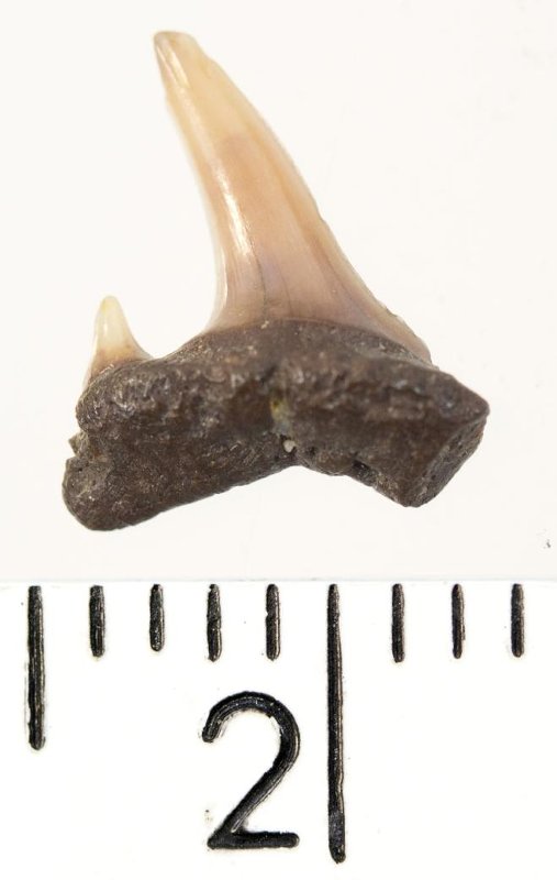 Мелкий боковой зуб с коронкой рыжевато-бежевого цвета, колюще-режущего типа, S-образно изогнутой, с гладким режущим краем. С лингвальной стороны у основания коронки на эмали имеется скульптура в виде слабой продольной струйчатости. Корень бурый, арочный, умеренно массивный, со следами окатанности. Имеется одна питательная борозда с лингвальной стороны корня. Имелась одна пара добавочных зубцов коронки, сохранился только левый.