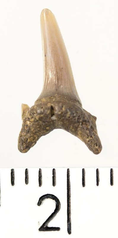 Мелкий боковой зуб с коронкой рыжевато-бежевого цвета, колюще-режущего типа, S-образно изогнутой, с гладким режущим краем. С лингвальной стороны у основания коронки на эмали имеется скульптура в виде слабой продольной струйчатости. Корень бурый, арочный, умеренно массивный, со следами окатанности. Имеется одна питательная борозда с лингвальной стороны корня. Имелась одна пара добавочных зубцов коронки, сохранился только левый.