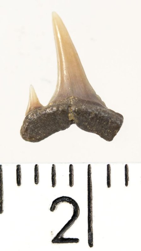 Мелкий боковой зуб с коронкой рыжевато-бежевого цвета, колюще-режущего типа, S-образно изогнутой, с гладким режущим краем. С лингвальной стороны у основания коронки на эмали имеется скульптура в виде слабой продольной струйчатости. Корень бурый, арочный, умеренно массивный, со следами окатанности. Имеется одна питательная борозда с лингвальной стороны корня. Имелась одна пара добавочных зубцов коронки, сохранился только левый.