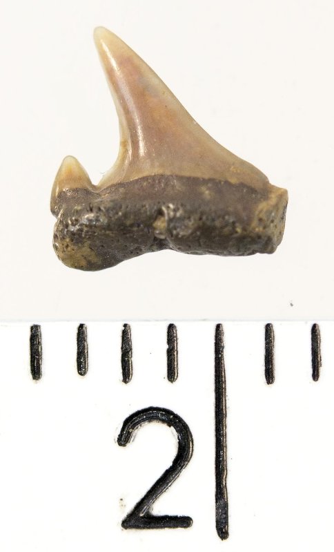 Мелкий боковой зуб с коронкой рыжевато-бежевого цвета, колюще-режущего типа, S-образно изогнутой, с гладким режущим краем. С лингвальной стороны у основания коронки на эмали имеется скульптура в виде слабой продольной струйчатости. Корень бурый, арочный, умеренно массивный, со следами окатанности. Имеется одна питательная борозда с лингвальной стороны корня. Имелась одна пара добавочных зубцов коронки, сохранился только левый.