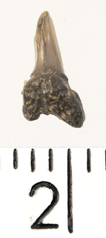 Мелкий боковой зуб с коронкой рыжевато-бежевого цвета, колюще-режущего типа, S-образно изогнутой, с гладким режущим краем. С лингвальной стороны у основания коронки на эмали имеется скульптура в виде слабой продольной струйчатости. Корень бурый, арочный, умеренно массивный, со следами окатанности. Имеется одна питательная борозда с лингвальной стороны корня. Имелась одна пара добавочных зубцов коронки, сохранился только левый.