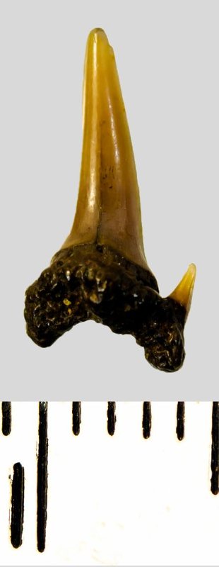 Мелкий боковой зуб с коронкой темно-бежевого цвета, колюще-режущего типа, S-образно изогнутой, с гладким режущим краем. С лингвальной стороны у основания коронки на эмали имеется скульптура в виде слабой продольной струйчатости. Корень бурый, арочный, умеренно массивный, со следами окатанности. Имеется одна питательная борозда с лингвальной стороны корня. Имелась одна пара добавочных зубцов коронки, сохранился только правый.