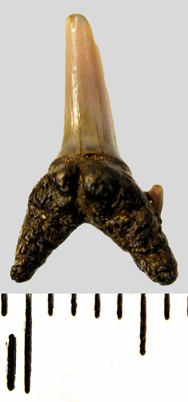 Мелкий боковой зуб с коронкой темно-бежевого цвета, колюще-режущего типа, S-образно изогнутой, с гладким режущим краем. С лингвальной стороны у основания коронки на эмали имеется скульптура в виде слабой продольной струйчатости. Корень бурый, арочный, умеренно массивный, со следами окатанности. Имеется одна питательная борозда с лингвальной стороны корня. Имелась одна пара добавочных зубцов коронки, сохранился только правый.