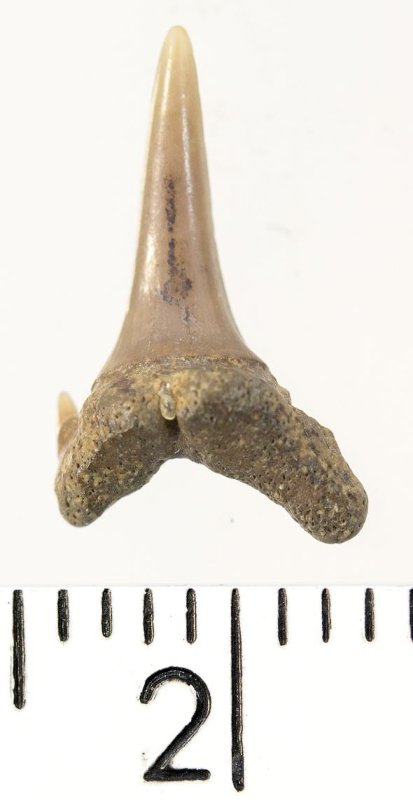 Зуб. Акула. Eostriatolamia subulata (Agassiz, 1843). Классификация: Хордовые Chordata, Позвоночные Vertebrata, Хрящевые рыбы Chondrichthyes, Пластиножаберные Elasmobranchii, Акулы Selachii, Ламнообразные Lamniformes, Песчаные акулы Odontaspididae