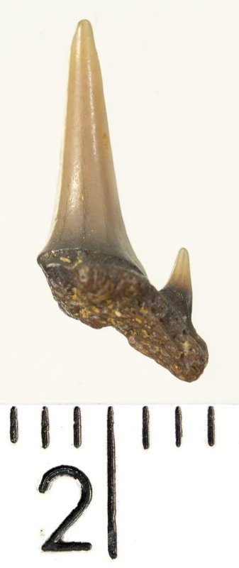 Зуб. Акула. Eostriatolamia subulata (Agassiz, 1843). Классификация: Хордовые Chordata, Позвоночные Vertebrata, Хрящевые рыбы Chondrichthyes, Пластиножаберные Elasmobranchii, Акулы Selachii, Ламнообразные Lamniformes, Песчаные акулы Odontaspididae