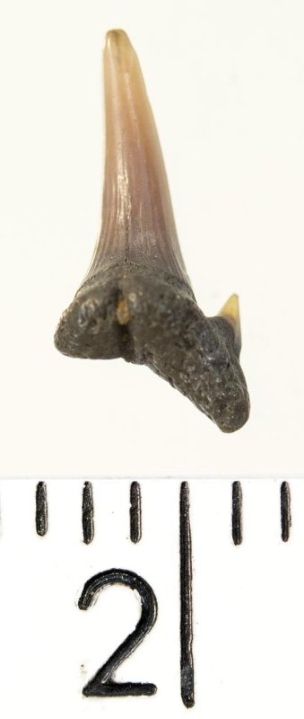 Мелкий боковой зуб с коронкой желтовато-бежевого цвета, колюще-режущего типа, S-образно изогнутой, с гладким режущим краем. С лингвальной стороны у основания коронки на эмали имеется скульптура в виде слабой продольной струйчатости. Корень бурый, арочный, умеренно массивный, со следами окатанности, левая ветвь утрачена. Имеется одна питательная борозда с лингвальной стороны корня. Имелась одна пара добавочных зубцов коронки, сохранился только правый.