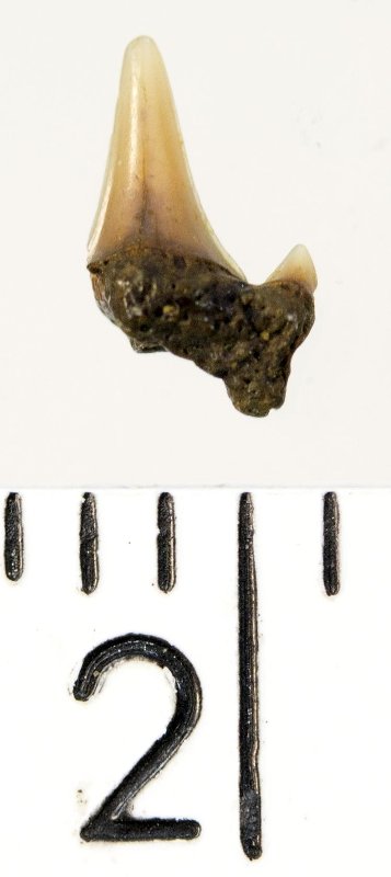Мелкий боковой зуб с коронкой желтовато-бежевого цвета, колюще-режущего типа, S-образно изогнутой, с гладким режущим краем. С лингвальной стороны у основания коронки на эмали имеется скульптура в виде слабой продольной струйчатости. Корень бурый, арочный, умеренно массивный, со следами окатанности, левая ветвь утрачена. Имеется одна питательная борозда с лингвальной стороны корня. Имелась одна пара добавочных зубцов коронки, сохранился только правый.