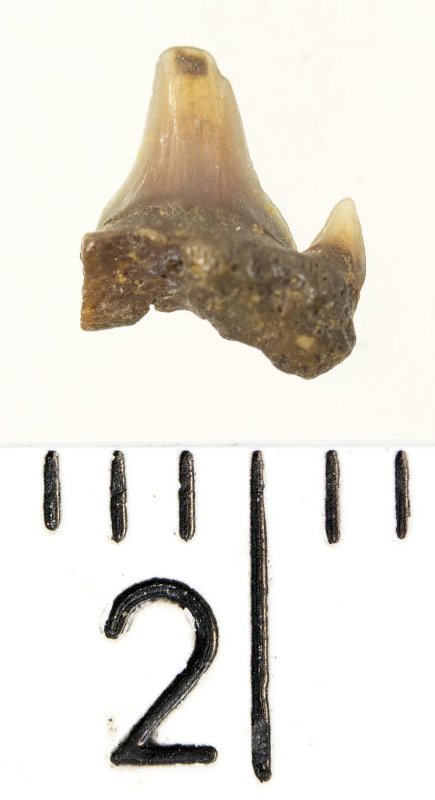 Мелкий боковой зуб с коронкой желтовато-бежевого цвета, колюще-режущего типа, S-образно изогнутой, с гладким режущим краем. С лингвальной стороны у основания коронки на эмали имеется скульптура в виде слабой продольной струйчатости. Корень бурый, арочный, умеренно массивный, со следами окатанности, левая ветвь утрачена. Имеется одна питательная борозда с лингвальной стороны корня. Имелась одна пара добавочных зубцов коронки, сохранился только правый.