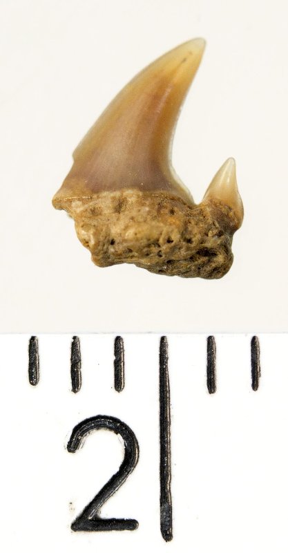 Мелкий боковой зуб с коронкой желтовато-бежевого цвета, колюще-режущего типа, S-образно изогнутой, с гладким режущим краем. С лингвальной стороны у основания коронки на эмали имеется скульптура в виде слабой продольной струйчатости. Корень бурый, арочный, умеренно массивный, со следами окатанности, левая ветвь утрачена. Имеется одна питательная борозда с лингвальной стороны корня. Имелась одна пара добавочных зубцов коронки, сохранился только правый.