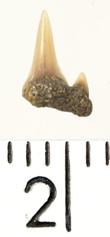 Мелкий боковой зуб с коронкой желтовато-бежевого цвета, колюще-режущего типа, S-образно изогнутой, с гладким режущим краем. С лингвальной стороны у основания коронки на эмали имеется скульптура в виде слабой продольной струйчатости. Корень бурый, арочный, умеренно массивный, со следами окатанности, левая ветвь утрачена. Имеется одна питательная борозда с лингвальной стороны корня. Имелась одна пара добавочных зубцов коронки, сохранился только правый.