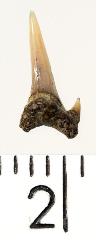 Мелкий боковой зуб с коронкой желтовато-бежевого цвета, колюще-режущего типа, S-образно изогнутой, с гладким режущим краем. С лингвальной стороны у основания коронки на эмали имеется скульптура в виде слабой продольной струйчатости. Корень бурый, арочный, умеренно массивный, со следами окатанности, левая ветвь утрачена. Имеется одна питательная борозда с лингвальной стороны корня. Имелась одна пара добавочных зубцов коронки, сохранился только правый.