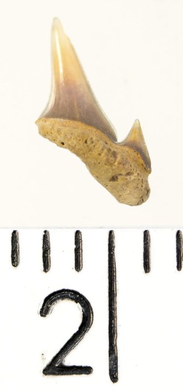 Мелкий боковой зуб с коронкой желтовато-бежевого цвета, колюще-режущего типа, S-образно изогнутой, с гладким режущим краем. С лингвальной стороны у основания коронки на эмали имеется скульптура в виде слабой продольной струйчатости. Корень бурый, арочный, умеренно массивный, со следами окатанности, левая ветвь утрачена. Имеется одна питательная борозда с лингвальной стороны корня. Имелась одна пара добавочных зубцов коронки, сохранился только правый.