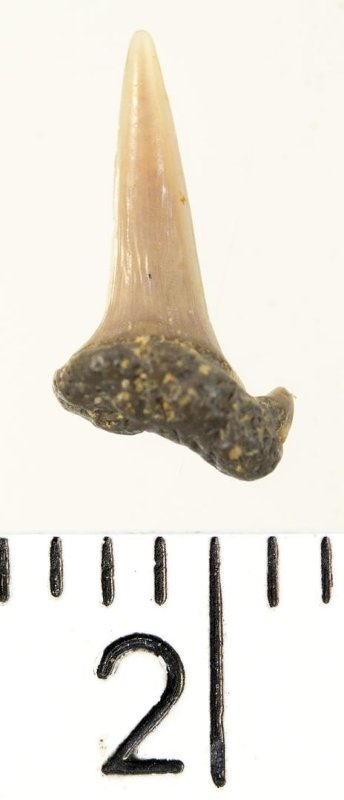 Зуб. Акула. Eostriatolamia subulata (Agassiz, 1843). Классификация: Хордовые Chordata, Позвоночные Vertebrata, Хрящевые рыбы Chondrichthyes, Пластиножаберные Elasmobranchii, Акулы Selachii, Ламнообразные Lamniformes, Песчаные акулы Odontaspididae