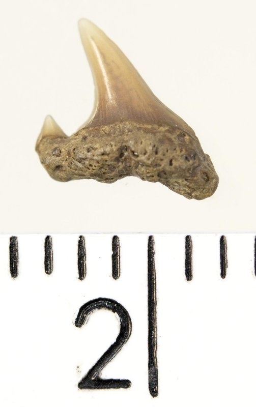 Мелкий боковой зуб с коронкой желтовато-бежевого цвета, колюще-режущего типа, S-образно изогнутой, с гладким режущим краем. С лингвальной стороны у основания коронки на эмали имеется скульптура в виде слабой продольной струйчатости. Корень бурый, арочный, умеренно массивный, со следами окатанности, левая ветвь утрачена. Имеется одна питательная борозда с лингвальной стороны корня. Имелась одна пара добавочных зубцов коронки, сохранился только правый.