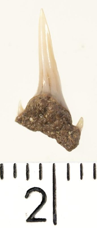 Зуб. Акула. Eostriatolamia subulata (Agassiz, 1843). Классификация: Хордовые Chordata, Позвоночные Vertebrata, Хрящевые рыбы Chondrichthyes, Пластиножаберные Elasmobranchii, Акулы Selachii, Ламнообразные Lamniformes, Песчаные акулы Odontaspididae