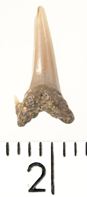 Зуб. Акула. Eostriatolamia subulata (Agassiz, 1843). Классификация: Хордовые Chordata, Позвоночные Vertebrata, Хрящевые рыбы Chondrichthyes, Пластиножаберные Elasmobranchii, Акулы Selachii, Ламнообразные Lamniformes, Песчаные акулы Odontaspididae