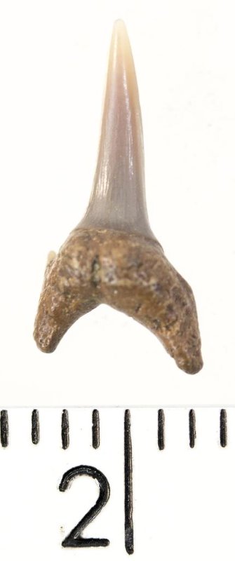 Мелкий боковой зуб с коронкой рыжевато-бежевого цвета, колюще-режущего типа, S-образно изогнутой, с гладким режущим краем. С лингвальной стороны у основания коронки на эмали имеется скульптура в виде слабой продольной струйчатости. Корень бурый, арочный, умеренно массивный, со следами окатанности. Имеется одна питательная борозда с лингвальной стороны корня. Имелась одна пара добавочных зубцов коронки, сохранился только левый.