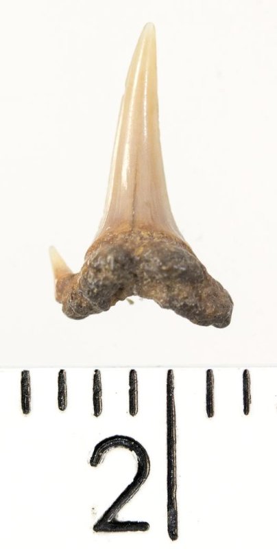 Мелкий боковой зуб с коронкой рыжевато-бежевого цвета, колюще-режущего типа, S-образно изогнутой, с гладким режущим краем. С лингвальной стороны у основания коронки на эмали имеется скульптура в виде слабой продольной струйчатости. Корень бурый, арочный, умеренно массивный, со следами окатанности. Имеется одна питательная борозда с лингвальной стороны корня. Имелась одна пара добавочных зубцов коронки, сохранился только левый.