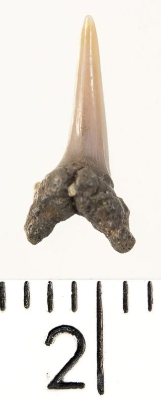 Мелкий боковой зуб с коронкой рыжевато-бежевого цвета, колюще-режущего типа, S-образно изогнутой, с гладким режущим краем. С лингвальной стороны у основания коронки на эмали имеется скульптура в виде слабой продольной струйчатости. Корень бурый, арочный, умеренно массивный, со следами окатанности. Имеется одна питательная борозда с лингвальной стороны корня. Имелась одна пара добавочных зубцов коронки, сохранился только левый.