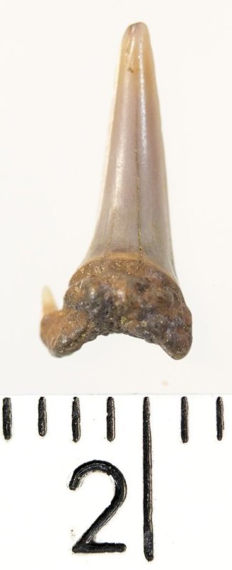 Мелкий боковой зуб с коронкой рыжевато-бежевого цвета, колюще-режущего типа, S-образно изогнутой, с гладким режущим краем. С лингвальной стороны у основания коронки на эмали имеется скульптура в виде слабой продольной струйчатости. Корень бурый, арочный, умеренно массивный, со следами окатанности. Имеется одна питательная борозда с лингвальной стороны корня. Имелась одна пара добавочных зубцов коронки, сохранился только левый.