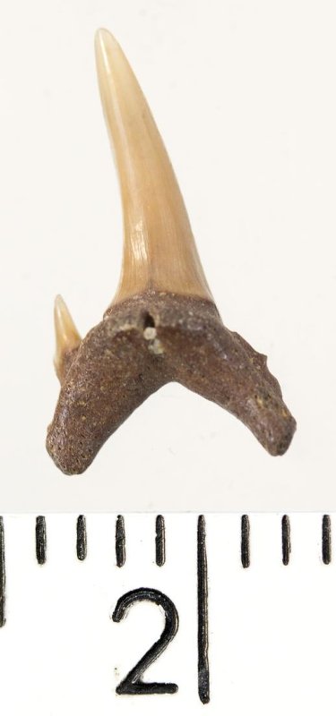 Мелкий боковой зуб с коронкой рыжевато-бежевого цвета, колюще-режущего типа, S-образно изогнутой, с гладким режущим краем. С лингвальной стороны у основания коронки на эмали имеется скульптура в виде слабой продольной струйчатости. Корень бурый, арочный, умеренно массивный, со следами окатанности. Имеется одна питательная борозда с лингвальной стороны корня. Имелась одна пара добавочных зубцов коронки, сохранился только левый.