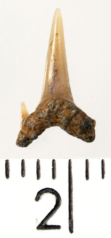 Мелкий боковой зуб с коронкой рыжевато-бежевого цвета, колюще-режущего типа, S-образно изогнутой, с гладким режущим краем. С лингвальной стороны у основания коронки на эмали имеется скульптура в виде слабой продольной струйчатости. Корень бурый, арочный, умеренно массивный, со следами окатанности. Имеется одна питательная борозда с лингвальной стороны корня. Имелась одна пара добавочных зубцов коронки, сохранился только левый.