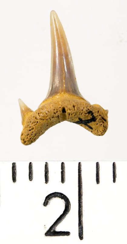 Мелкий боковой зуб с коронкой рыжевато-бежевого цвета, колюще-режущего типа, S-образно изогнутой, с гладким режущим краем. С лингвальной стороны у основания коронки на эмали имеется скульптура в виде слабой продольной струйчатости. Корень бурый, арочный, умеренно массивный, со следами окатанности. Имеется одна питательная борозда с лингвальной стороны корня. Имелась одна пара добавочных зубцов коронки, сохранился только левый.