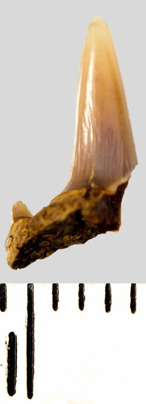 Мелкий боковой зуб с коронкой рыжевато-бежевого цвета, колюще-режущего типа, S-образно изогнутой, с гладким режущим краем. С лингвальной стороны у основания коронки на эмали имеется скульптура в виде слабой продольной струйчатости. Корень охристый, арочный, умеренно массивный, со следами окатанности, правая ветвь утрачена. Имеется одна питательная борозда с лингвальной стороны корня. Имелась одна пара добавочных зубцов коронки, сохранился только левый.